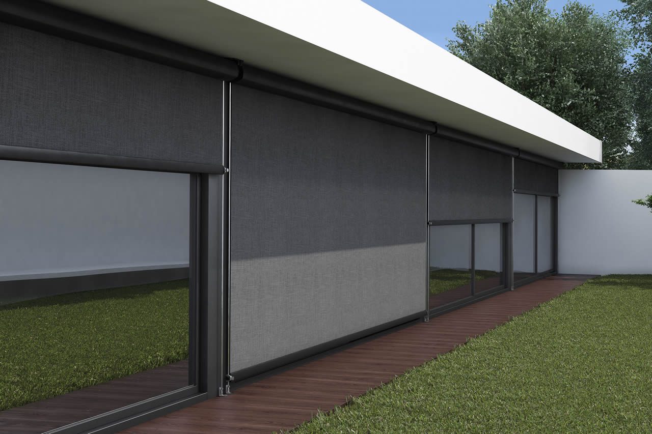Cae en forma de panel y bloquea rayos solares laterales. Muy útil en balcones y zonas expuestas al sol de la tarde.